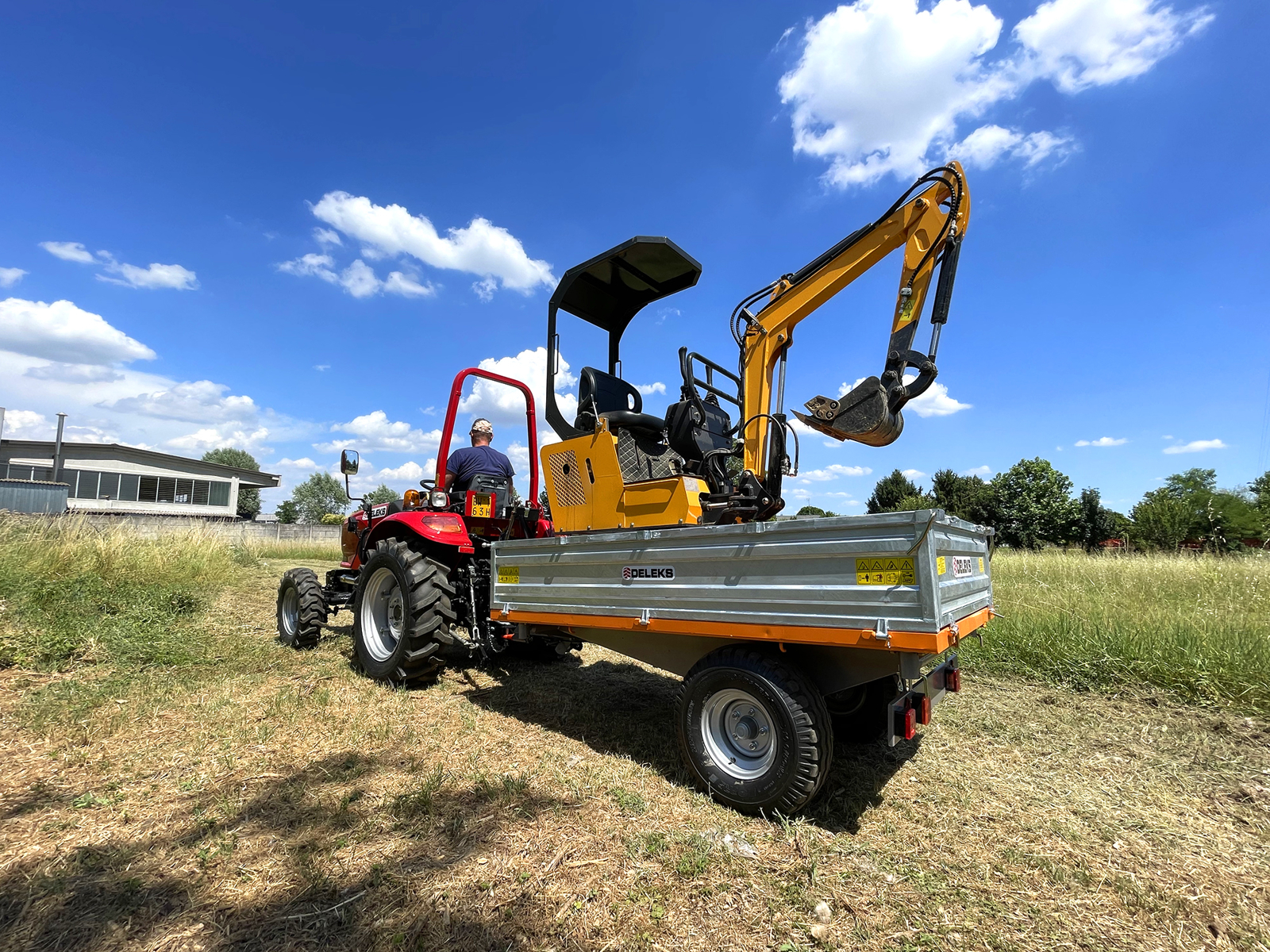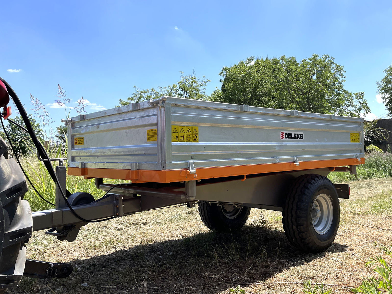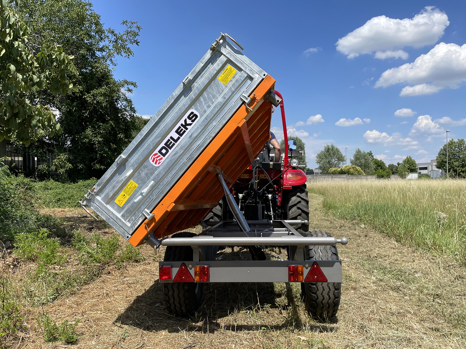 La remorque tri-benne DELEKS® RM14-T3 un essieu convient pour les tracteurs de 20 à 70cv tels que Valpadana, Renault, Massey Ferguson, New Holland Boomer, Antonio Carraro Tigre, John Deere Series 2.