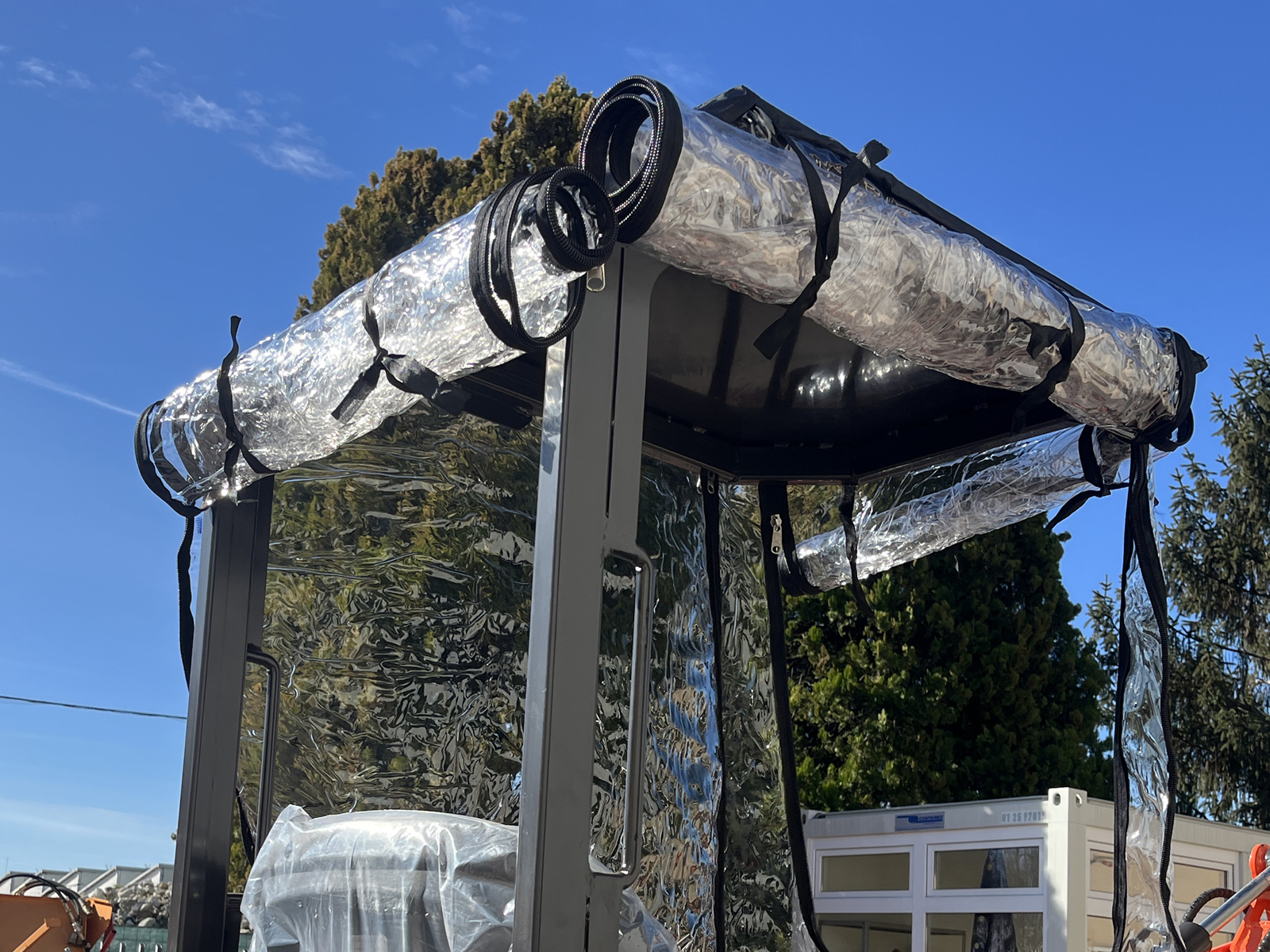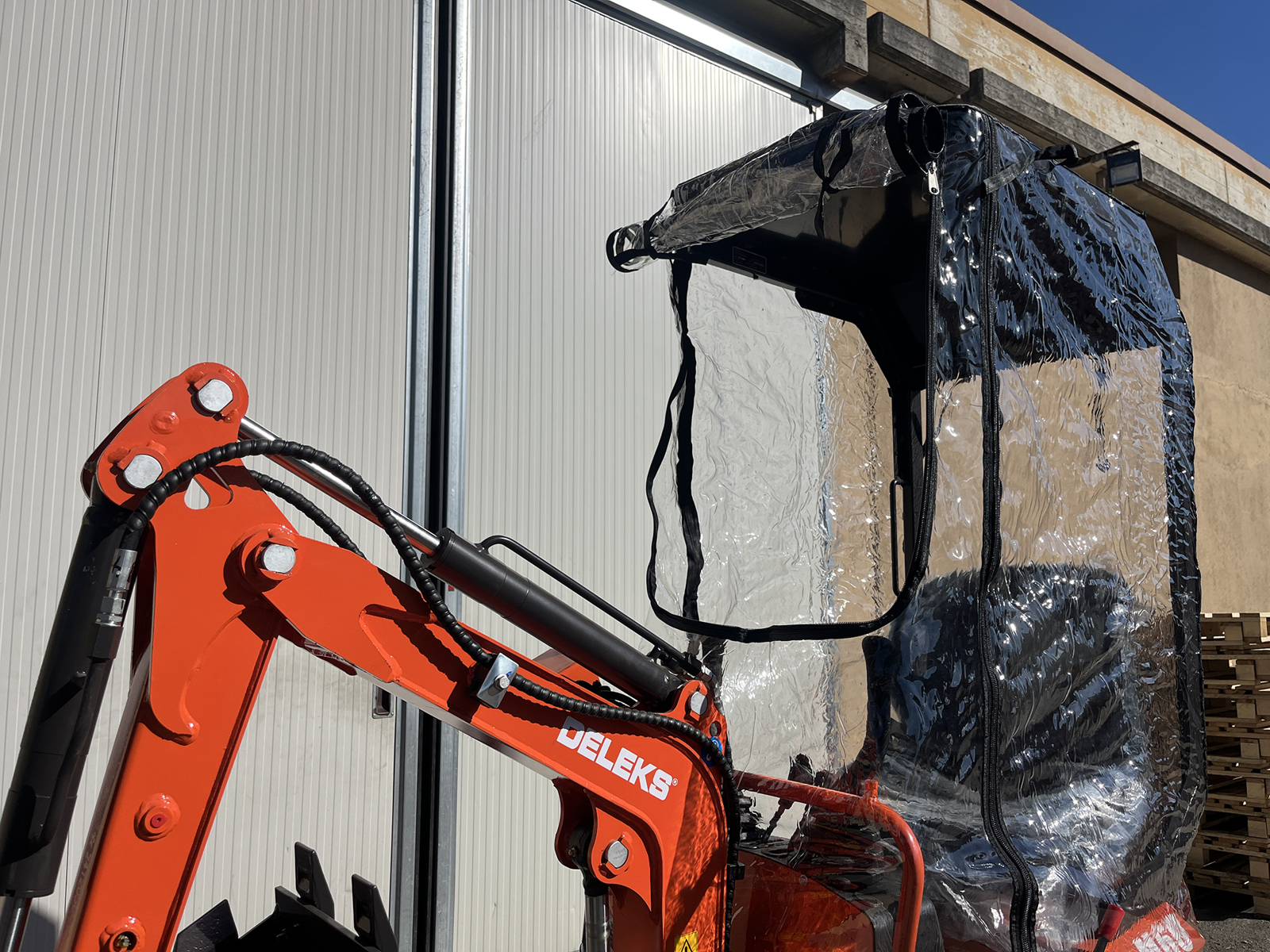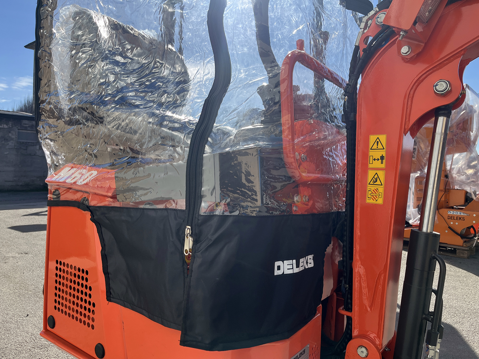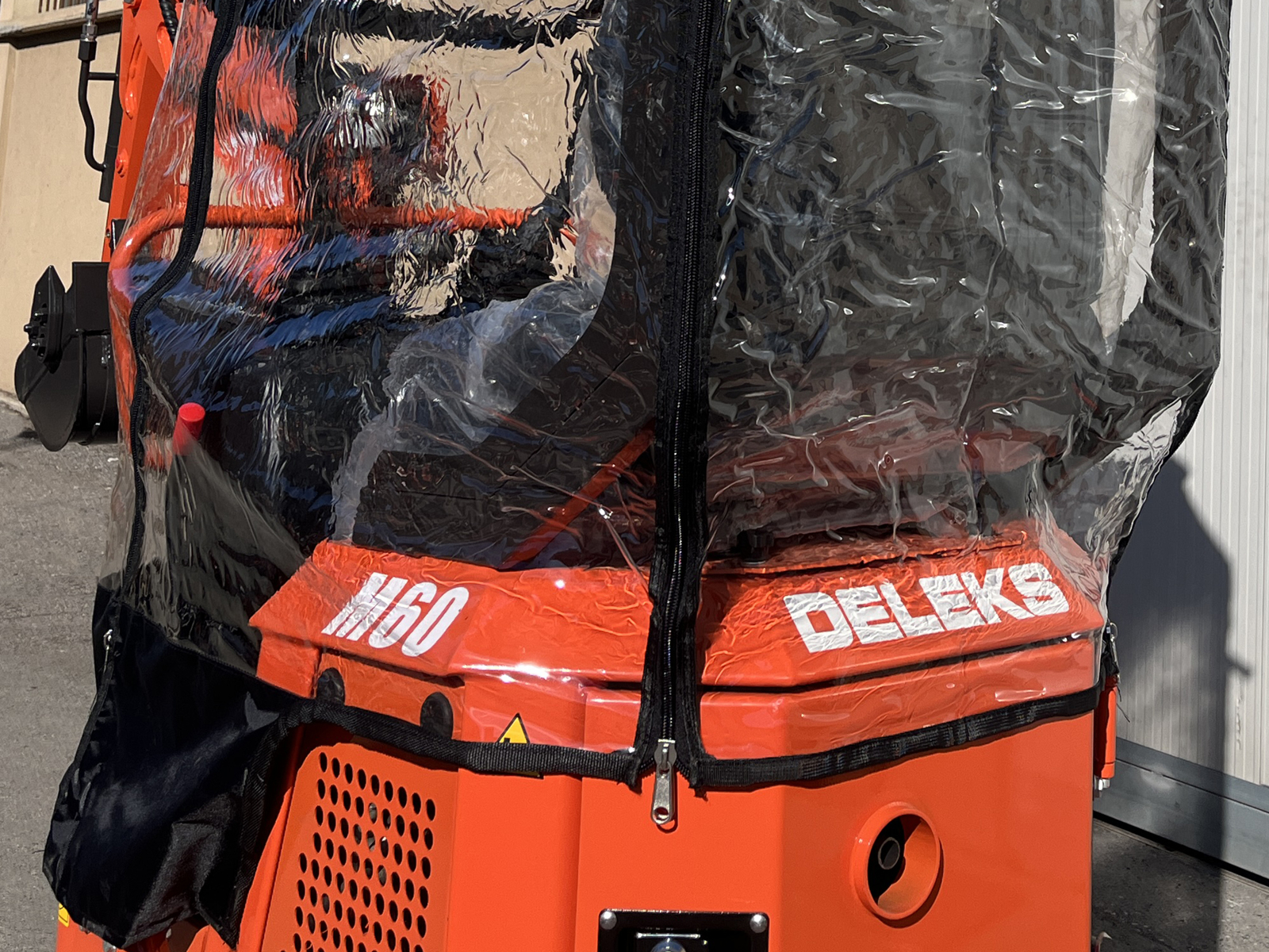 SCHLIESSENEgal ob das Wetter mitspielt oder nicht - der Universal Regen- und Windschutz ist die perfekte Lösung für den DELEKS® Minibagger M60.