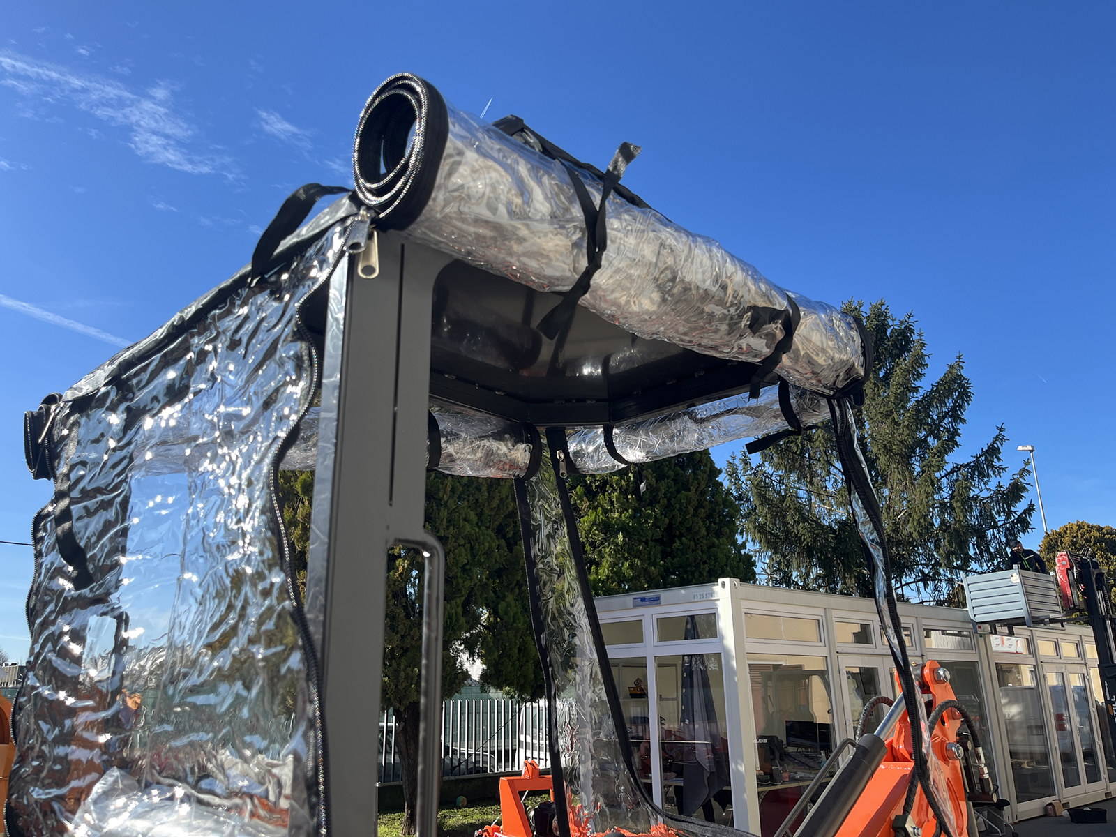 Schlägt das Wetter um, lässt sich der Universal-Regenschutz für den Minibagger M60 schnell abnehmen.