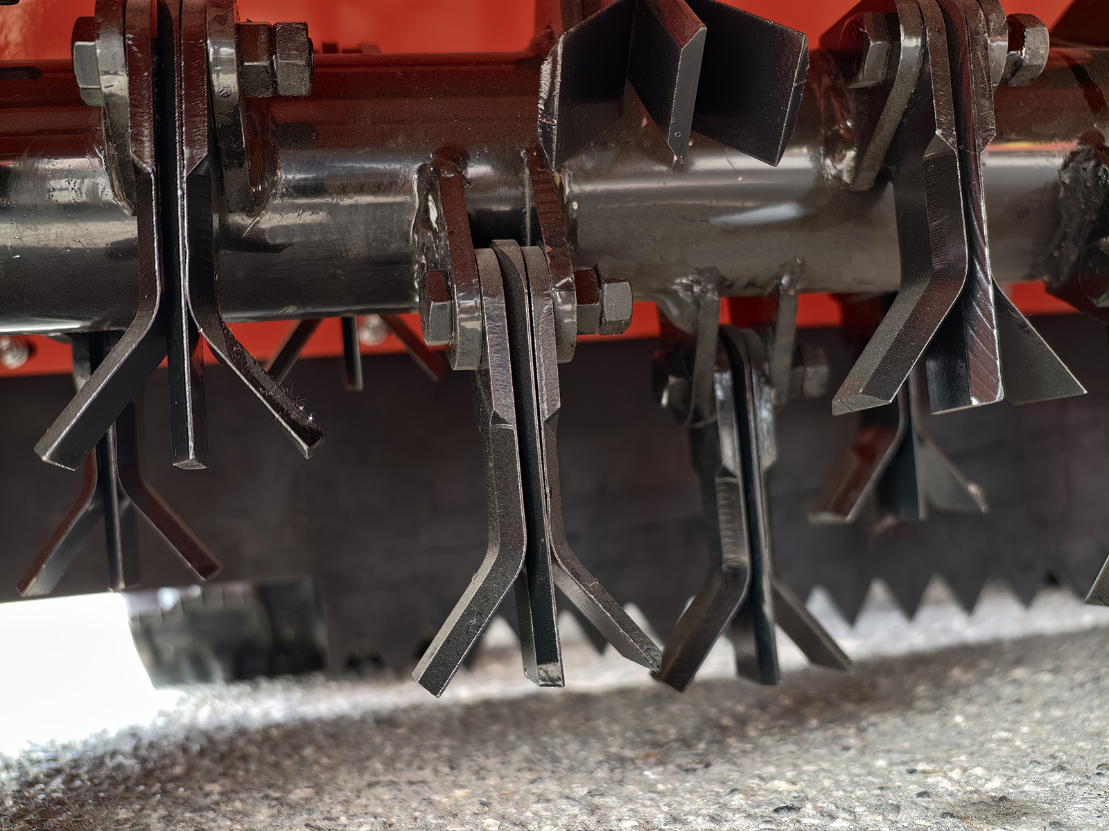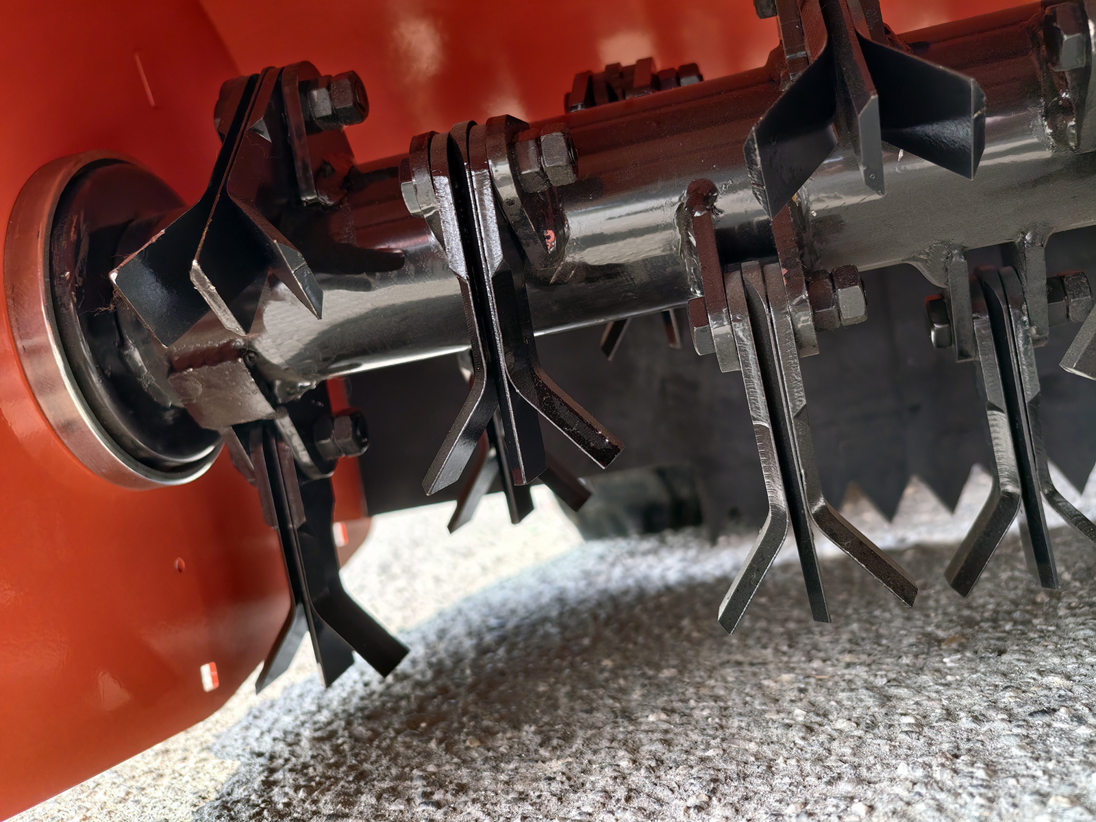 Das Zerkleinerungssystem basiert auf einem Hochträgheitsrotor mit 22 Messergruppen, wobei jede Gruppe aus 3 Elementen besteht (2 gebogene Messer und 1 gerades zentrales Messer), insgesamt 66 Messer. Diese Konfiguration gewährleistet eine höhere Schnittleistung und eine bessere Zerkleinerungsqualität bei Gras, Gestrüpp und kleinen Holzresten. Das schwimmend gelagerte Messersystem reduziert das Risiko von Rotorschäden bei unbeabsichtigten Kollisionen mit Steinen oder Fremdkörpern. Die Kraftübertragung erfolgt über ein Doppelriemensystem, das im Vergleich zu Einriemenlösungen eine höhere Zuverlässigkeit und eine bessere Kraftverteilung bietet.