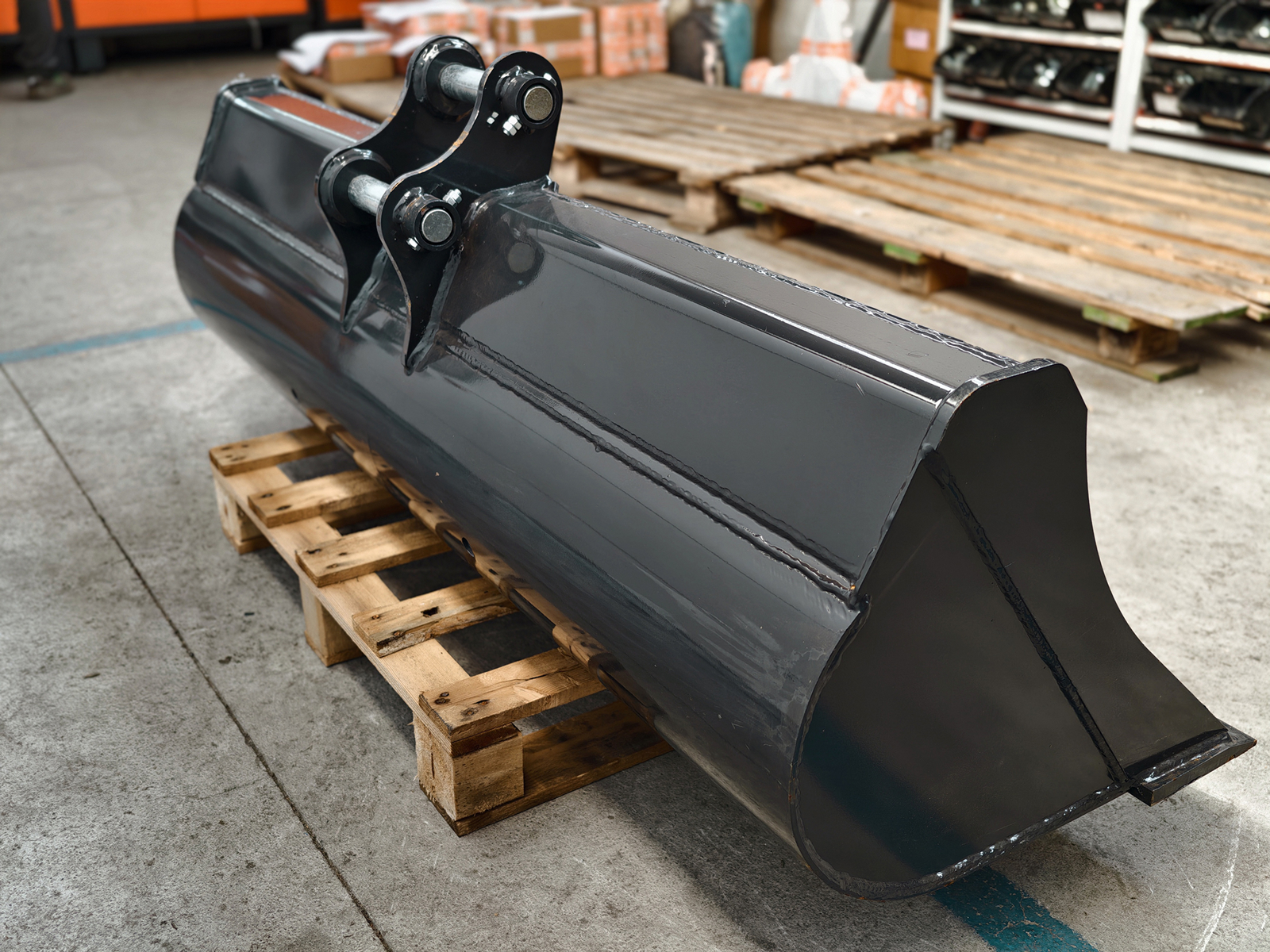150 cm DELEKS® Breitschaufel für Minibagger mit S280-Aufnahme, inklusive 2 Befestigungsbolzen.