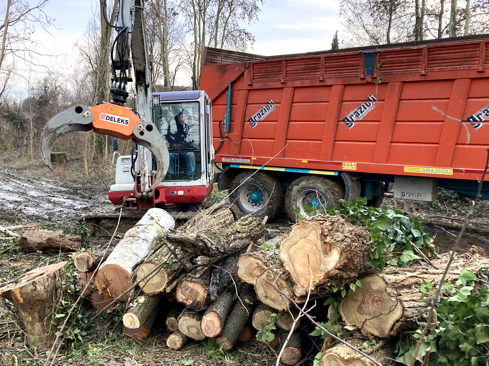 Graifer hidraulic DK-16 universal cu cilindru orizontal pentru manipularea, încărcarea și descărcarea trunchiurilor de copaci. Complet cu rotor Lombarda Ingranaggi GR-30F 3,0 Tone 360 ° continuu.