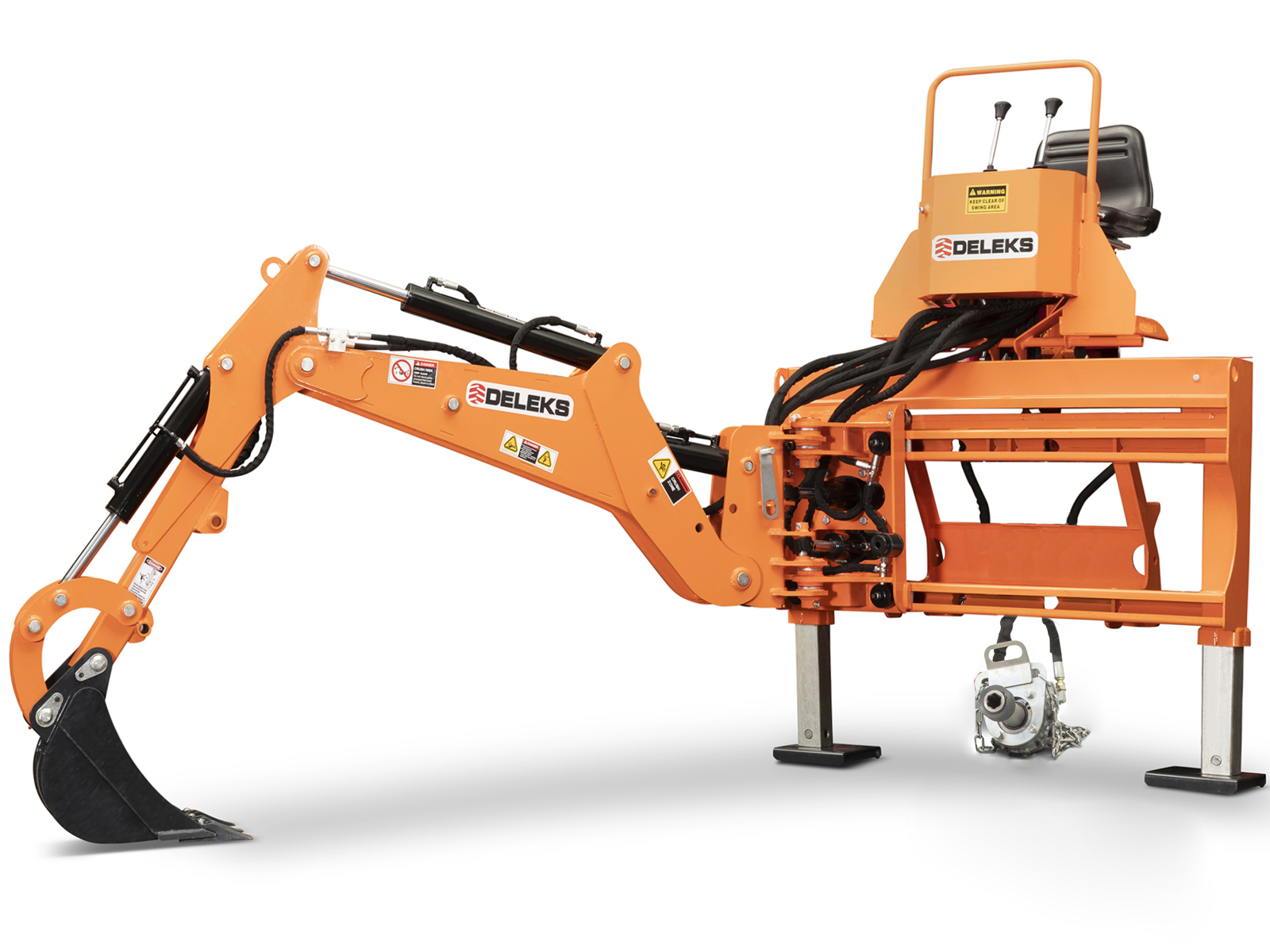 Heckbagger DELEKS®  für Traktor mit Dreipunktaufnahme, mit Baggerlöffel - Hydraulikverteiler: Hydrocontrol (Made in Italy) - Hydr. Seitenverschiebung des Auslegers - CE Zertifikat.