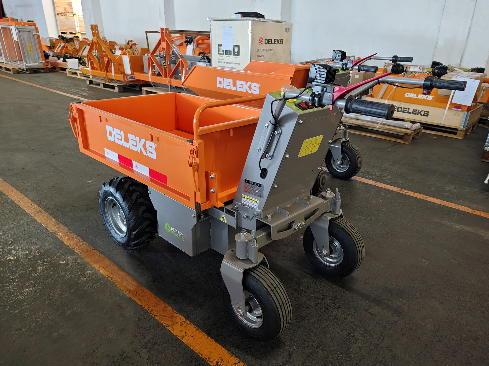 DELEKS® XE500HFL Lithium Electric Dumper with 1000W 48V electric motor, removable 48V 60Ah lithium battery, rectangular steel body with extendable side panels and hydraulic tipping.