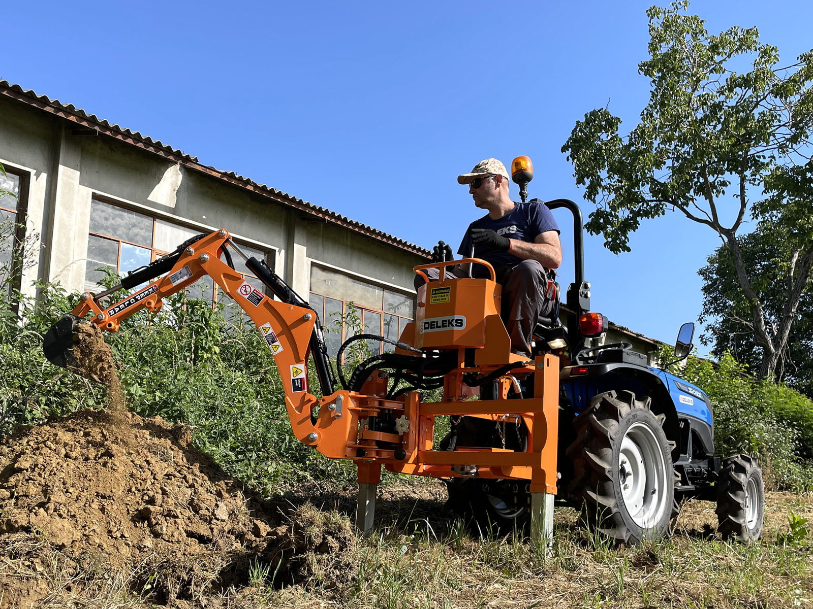 Mini backhoe for universal compact tractors - DELEKS® DRS-1000T - 358 kg - Side shift frame with manual locking - Oil system.