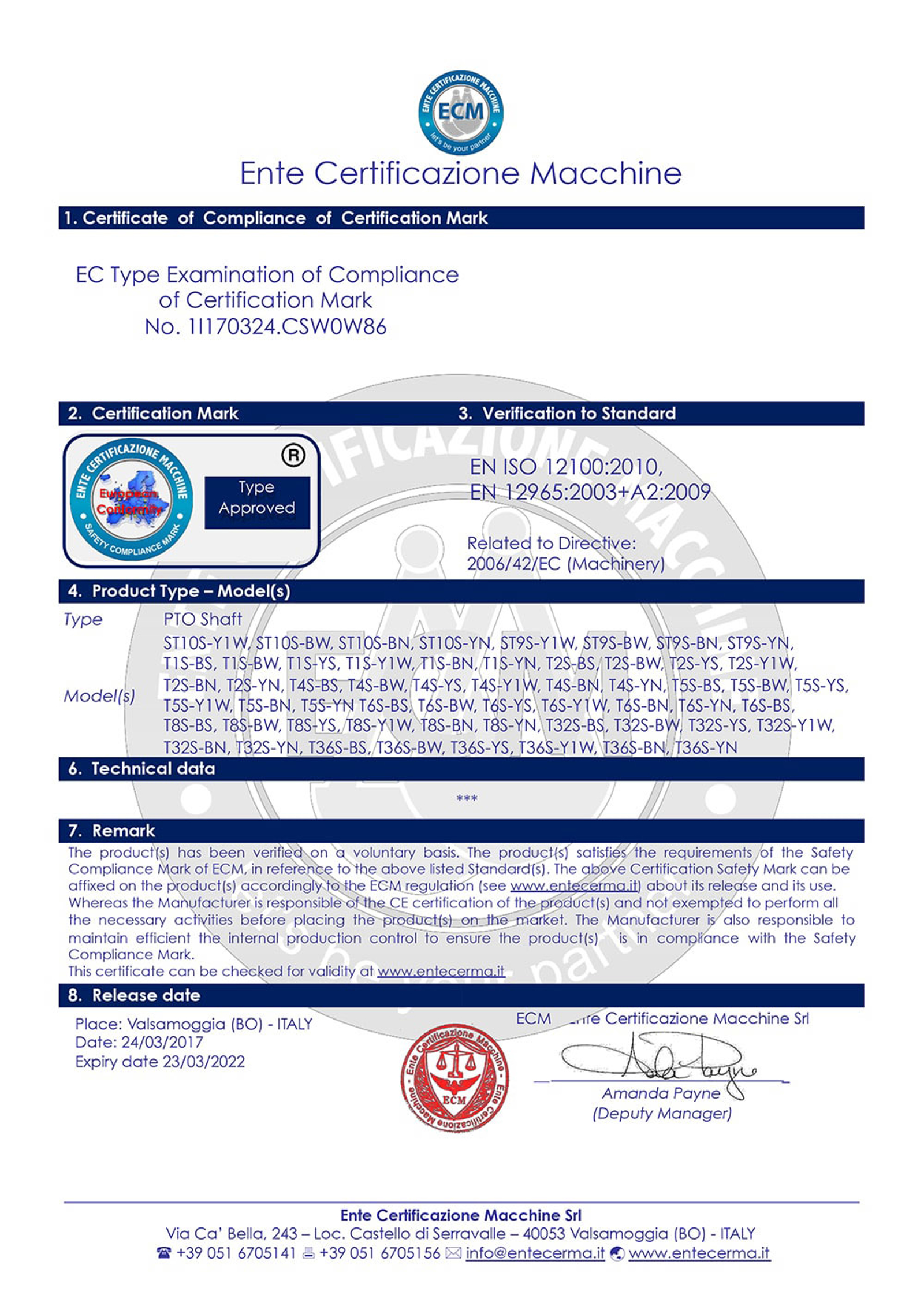 Certificarea ECM Ente Certificazione Macchine (Modena, Italia).