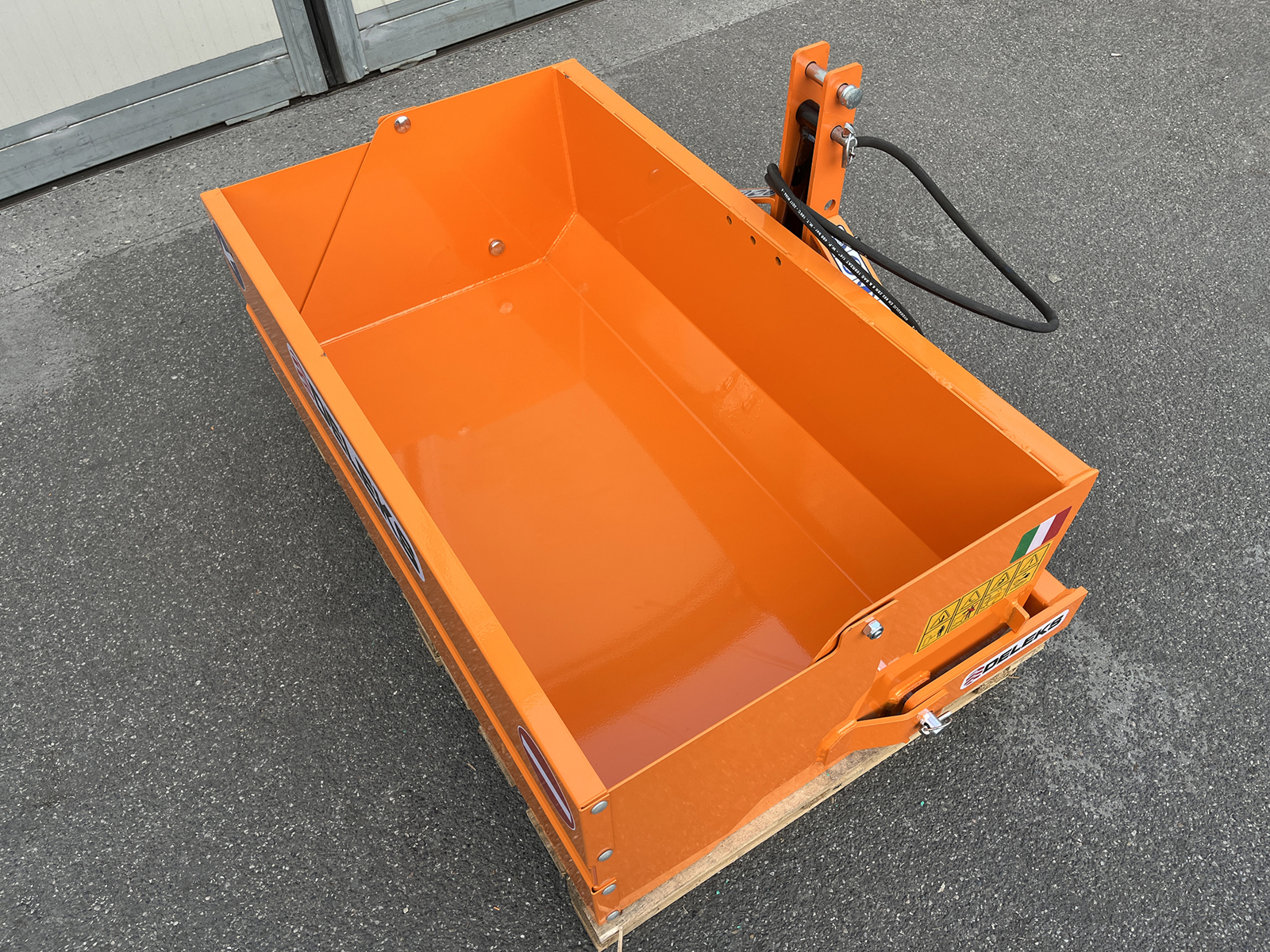 Cupă "Made in Italy" cu basculanta hidraulică BUCKET-120-H pentru încărcare, transport de materiale cum ar fi pământ, pietriș, zăpadă și operații de curățare generală a deșeurilor. Specificații pentru tractoarele cu putere redusă de 14-40 CP, cum ar fi New Holland Boomer 25-30, John Deere Seria 1-2, Pasquali, Valpadana, BCS sau tractoare japoneze cum ar fi seria Kubota B, Iseki, Yanmar, Mitsubishi. Atac universal 3 puncte Cat. 1 (19-22mm). Conformitatea CE. Garanție 2 ani.