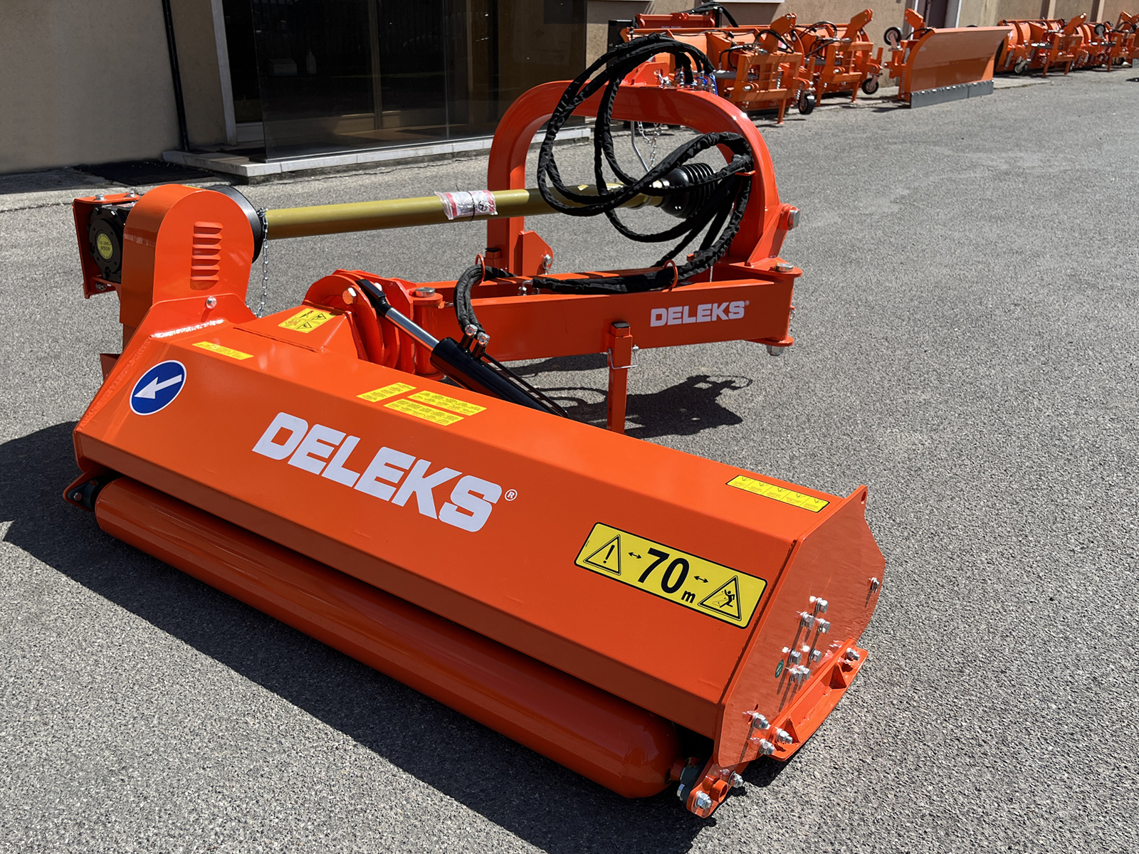 Über die Spur hinaus und in geneigter Arbeitsstellung s säubert der Deleks Böschungsmulcher Straßenränder und Gräben, bei Vertikaler Arbeitsstellung hingegen stutzt er Hecken und Böschungen. Durch das in der Mitte des Gerätes verbaute Getriebe kann der Mulcher auch mittig hinter dem Schlepper gefahren werden, damit eignet er sich auch Bestens zur Ausführung von Arbeiten in schmalen Reihenabständen.