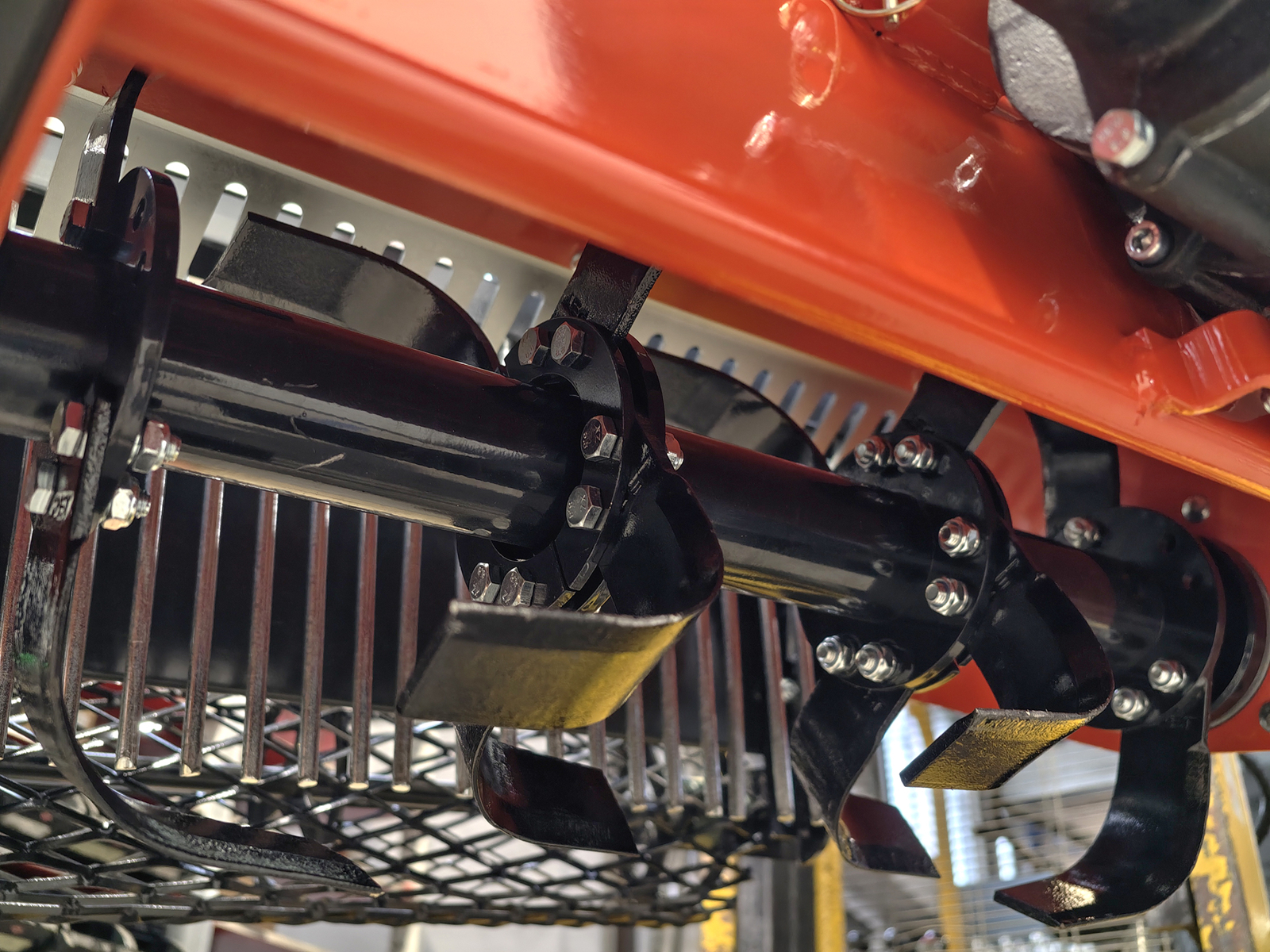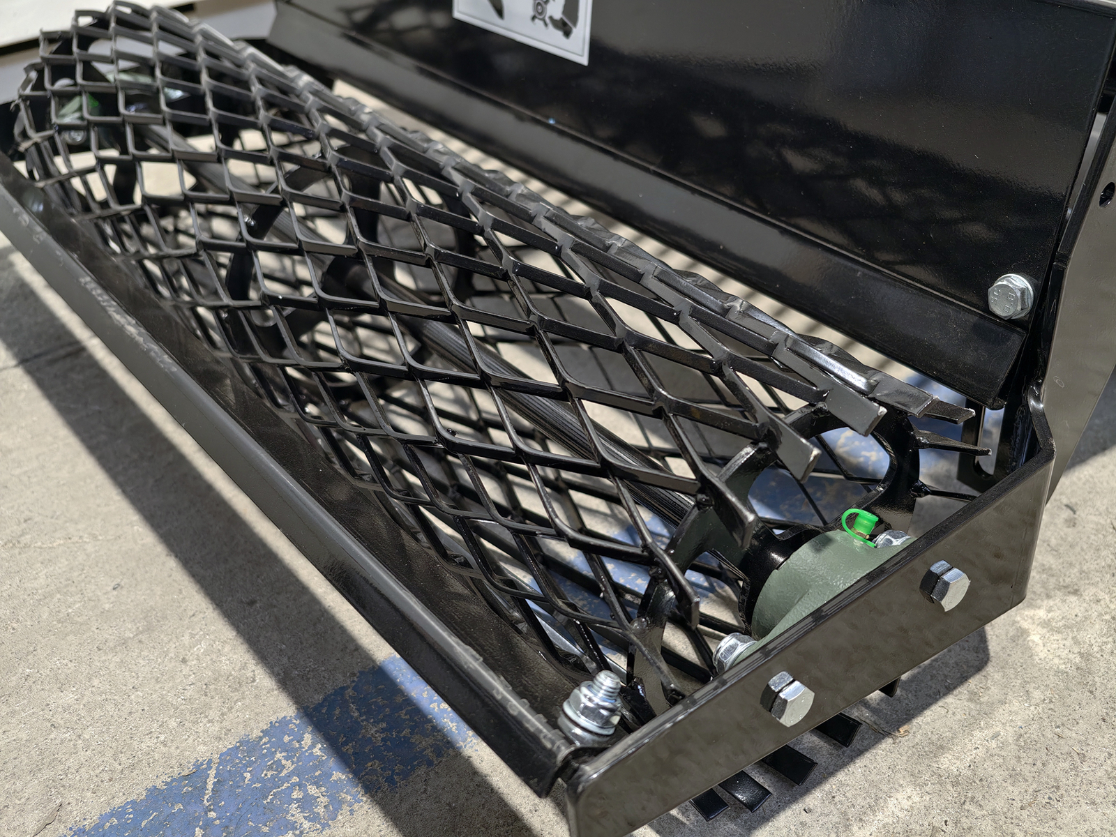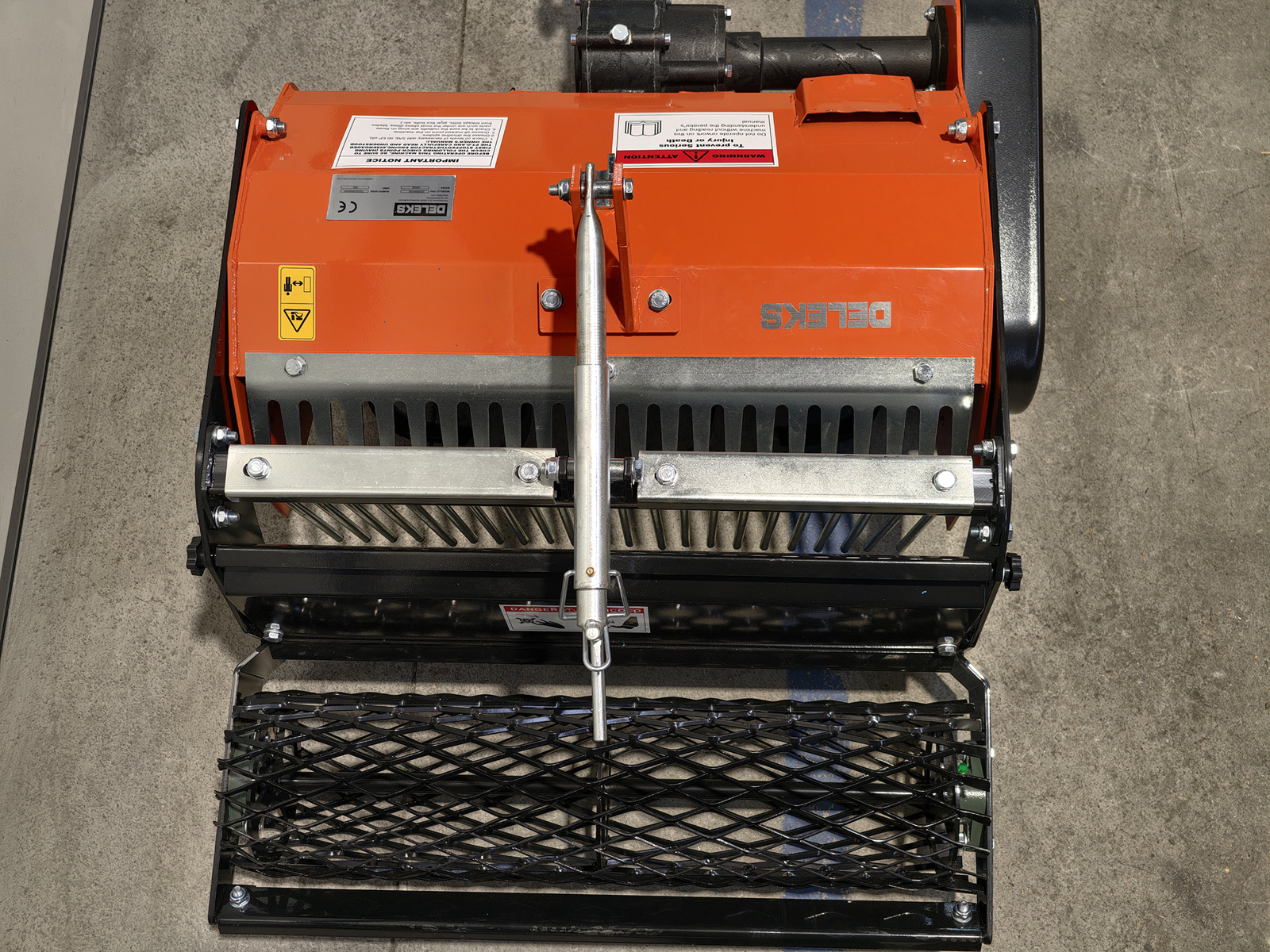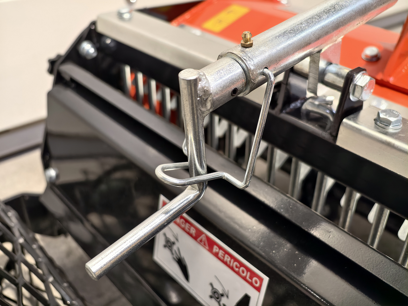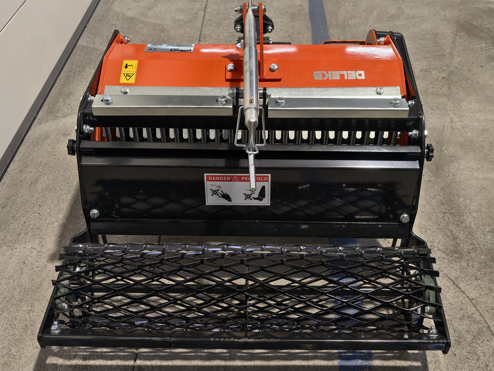 FERMEREnfouisseur de pierres DELEKS® avec rouleau grillagé pour motoculteur, compatible avec les motoculteurs BCS, Ferrari et Pasquali, livré avec un attelage rapide mâle.