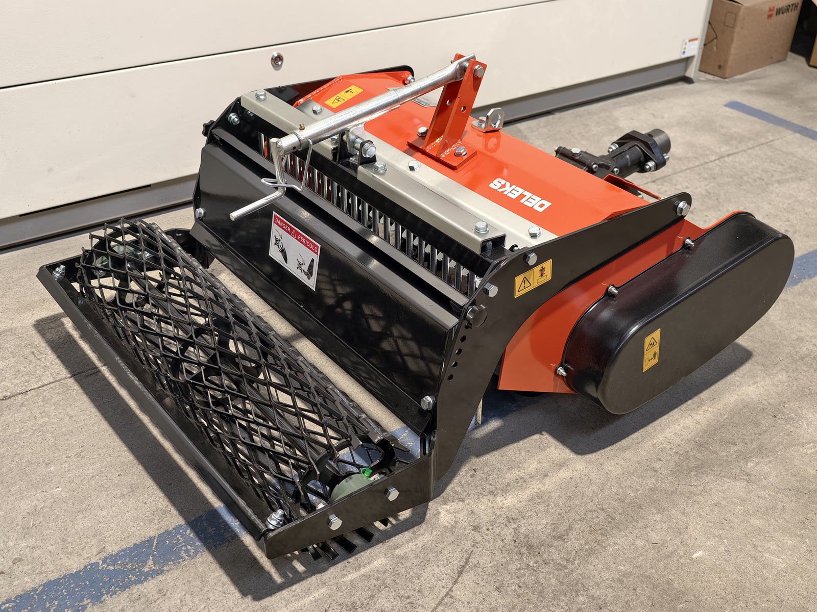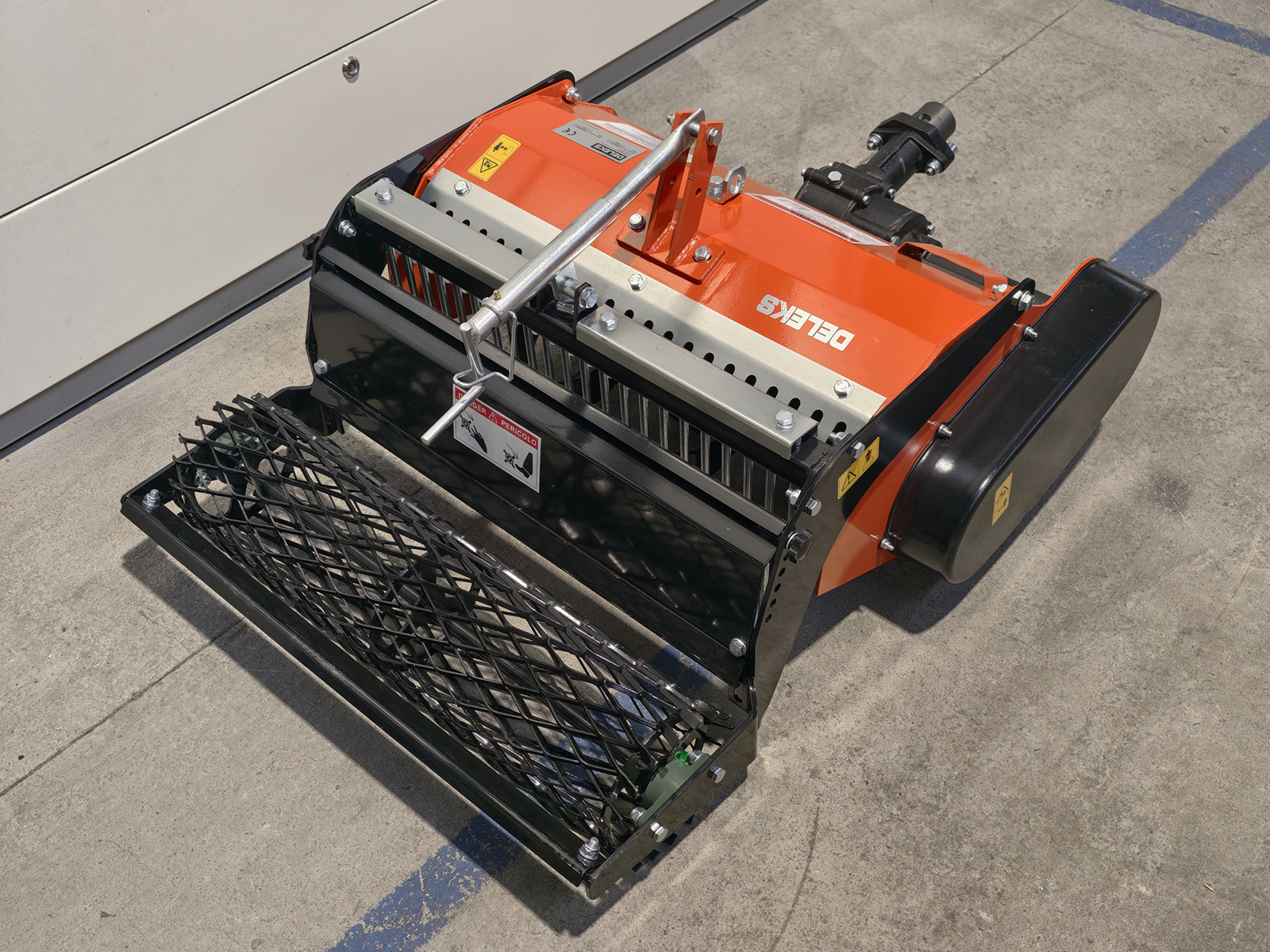 Enfouisseur de pierres DELEKS® avec rouleau grillagé pour motoculteur, compatible avec les motoculteurs BCS, Ferrari et Pasquali, livré avec un attelage rapide mâle.
