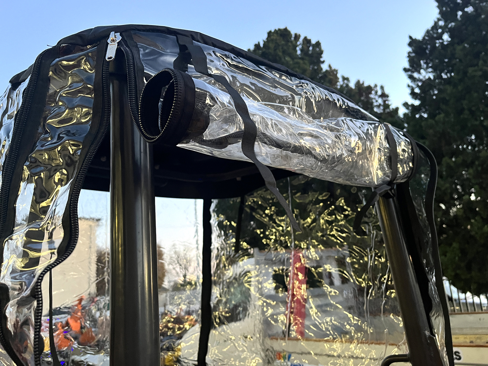 This accessory is not recommended or designed for sun protection or prolonged use in intense sunlight. This is because the material, being transparent and primarily focused on waterproofing, can accelerate the greenhouse effect inside the cabin (dramatically raising the temperature) and suffer premature damage (discolouration or cracking) due to constant and direct exposure to UV rays.