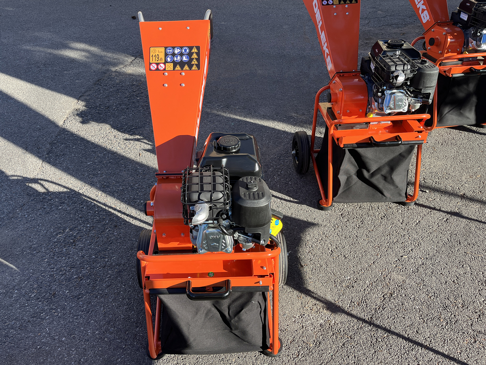 Компактный измельчитель древесины DELEKS® DK-300 BS с бензиновым двигателем Briggs & Stratton XR950 мощностью 6,5 л.с., предназначенный для измельчения веток и отходов обрезки в бытовых и полупрофессиональных условиях.