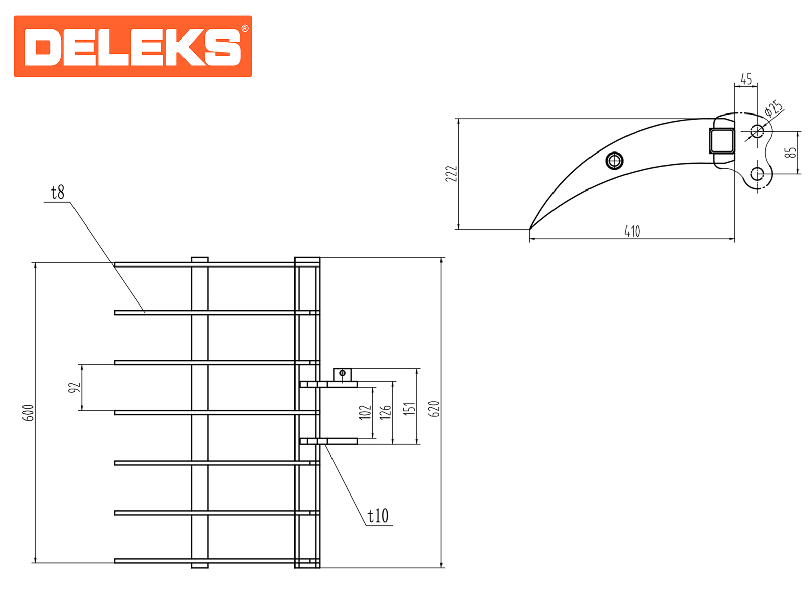Мультириппер-ковш DELEKS® шириной 60 см, также известный как грабли для мини-экскаваторов, предназначен для очистки, легкого рыхления, выравнивания и сортировки материалов непосредственно на поверхности грунта.